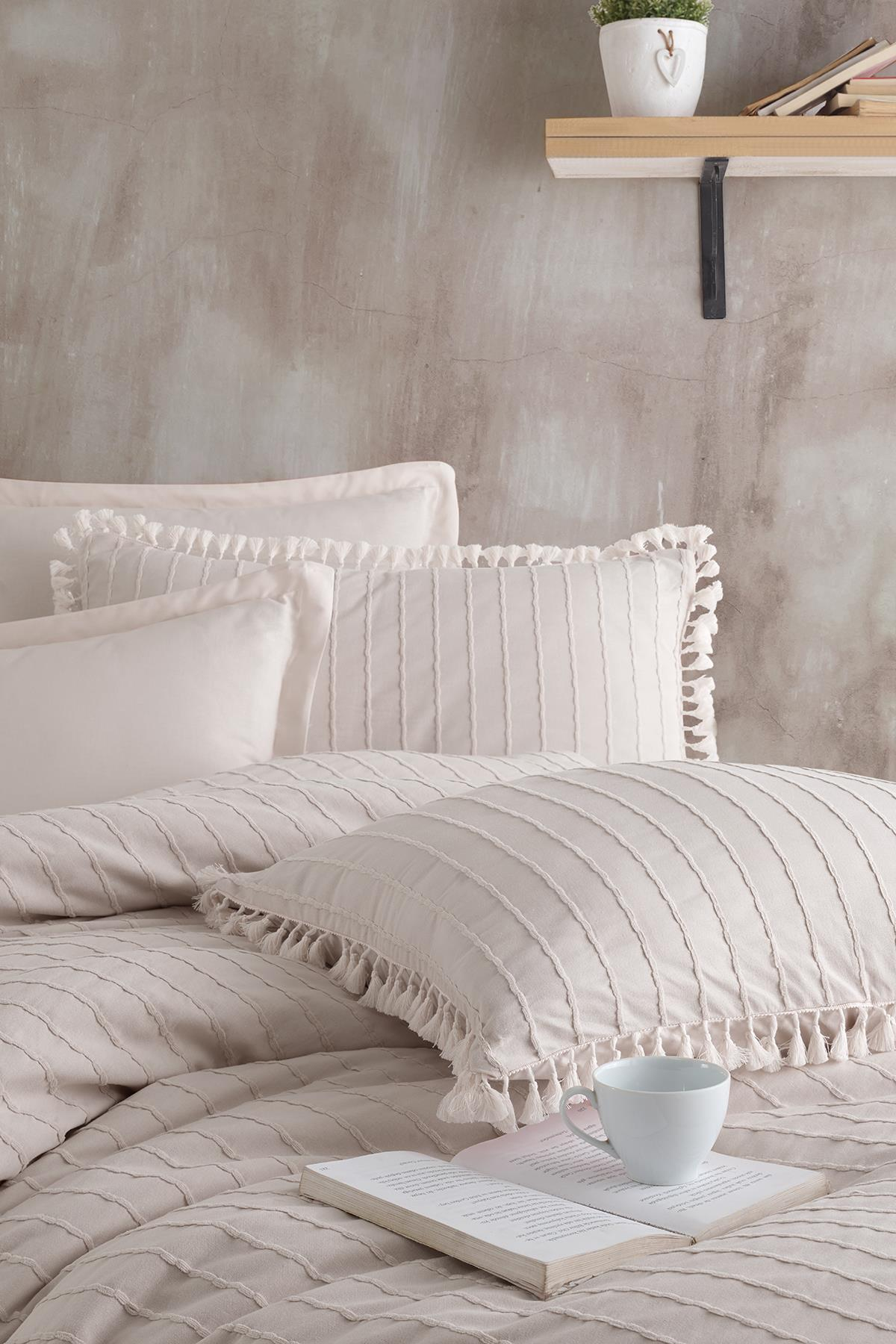 Nordqueen Ranforce %100 Pamuk Tek Kişilik Püsküllü Nevresim Seti Estina Taş Rengi